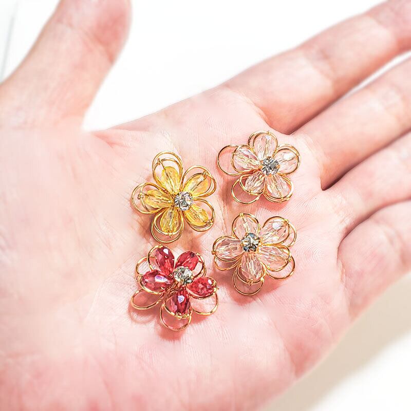 ガラス製の花びらとラインストーンをワイヤーで留め付けたフラワーパーツです✨