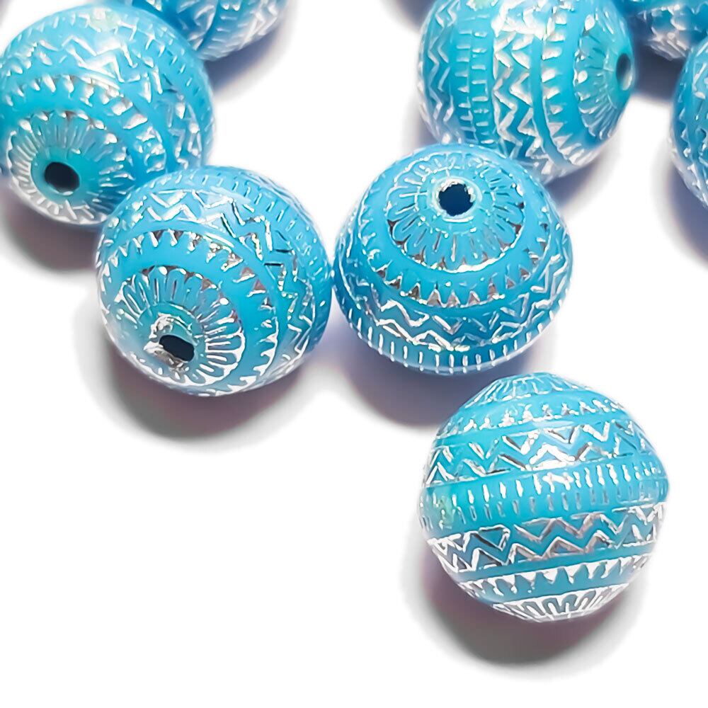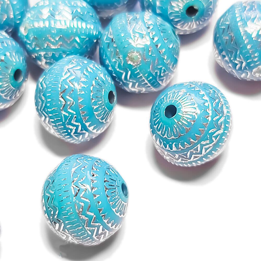 きれいなブルーのビーズに、シルバーで複雑な文様が描かれています。